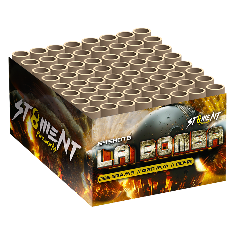 La Bomba! Knallend en fluitend het nieuwe jaar in? Dan is deze La Bomba-cake jouw perfecte keuze! Gebaseerd op de oude Estallar van St8ment schiet deze cake 64 schoten in heftige salvos van siervuurwerk en fluit in een hoog tempo de hemel in! Topper van de bovenste plank! n nProductinformatie: nType product: Siervuurwerk nEffect product: Cake nTube diameter: 20mm nFanshape: Nee nClassificatie: CAT.F2 nMinimale leeftijd: 16 jaar nLegaal afsteken op: 31 december nVeiligheidsafstand: minimaal 8 meter nGeschikt voor smalle straten: Ja nGeschikt in Gemeente vuurwerkverbod: Nee La Bomba 64 shots 20mm Goedkoop vuurwerk kopen bij Vuurwerkwinkel Hilversum