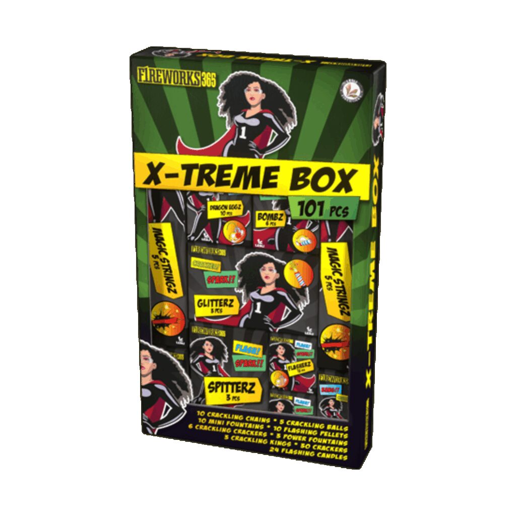 nMet deze X-treme Box ben jij de man voor alle evenementen! Knetter linten, ratelende kanonskogels, mini knallers, bliksemschichten, knetter ballen, discoflitsen en een aantal hele gave fonteinen! Helemaal geweldig! Kan het hele jaar door afgestoken worden!