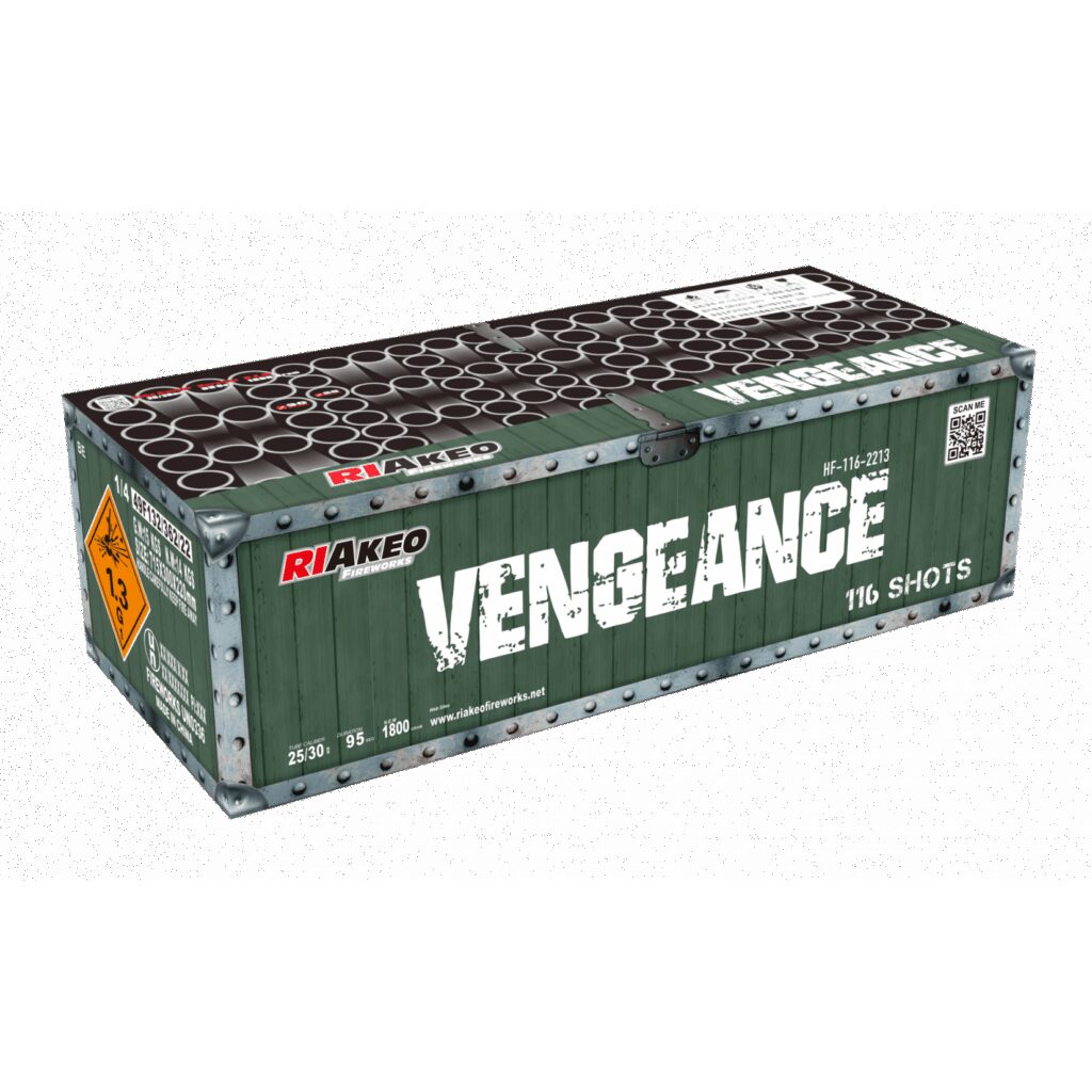 nDe Vengeance van Riakeo is een compound met 116 schoten afgevuurd in kaliber 20/30mm en bijna 2kg NEM. Effecten: Snelvuursequentie met verschillende effecten en uitwaaierende sequenties. Lange levensduur en luid knetterende finale.nDit product is verboden in Nederland.