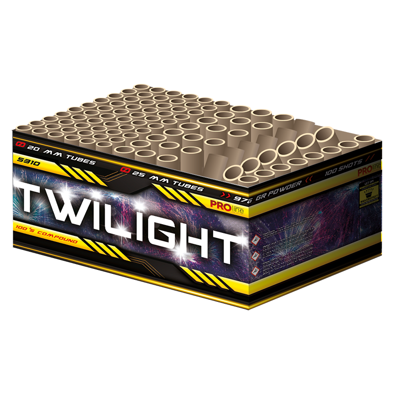 Pro-line Fireworks Twilight, 100 shots, 20+25mm compound. Gekleurde peony met snow-style crackling, gouden salvos met ghost-effecten, fan/z-shape effecten en double gold en enkel goud effecten vormen een ultieme opbouw van begin tot eind. n nProductinformatie: nType product: Siervuurwerk nEffect product: Compound nTube diameter: 20+25mm nFanshape: Ja nClassificatie: CAT.F2 nMinimale leeftijd: 16 jaar nLegaal afsteken op: 31 december nVeiligheidsafstand: minimaal 8 meter nGeschikt voor smalle straten: Nee nGeschikt in Gemeente vuurwerkverbod: Nee Twilight 100 shots 20+25mm Goedkoop vuurwerk kopen bij Vuurwerkwinkel Hilversum